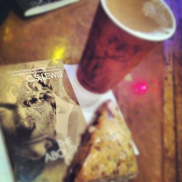 See: I see sanded and waxed hardwood floors, brick wall painted red, blue icicle lights hanging from a soffet, multiple chalkboard menus, and a wild collection of original artwork all over the walls. I see a menagerie of interesting characters floating through the shop, some professionals, some bicyclists, and others bent on personal expression. I also see my own collection of odd things… My second hand green leather purse with a long black scarf tied on, my trusty notebook, cell phone, a paperback C.S. Lewis book, a giant cup of cream colored dark roast coffee, and a square of cellophane squeezed into a crumpled heap and filled with crumbs from my breakfast. I look up and see sunlight blasting through the tall, arched windows.