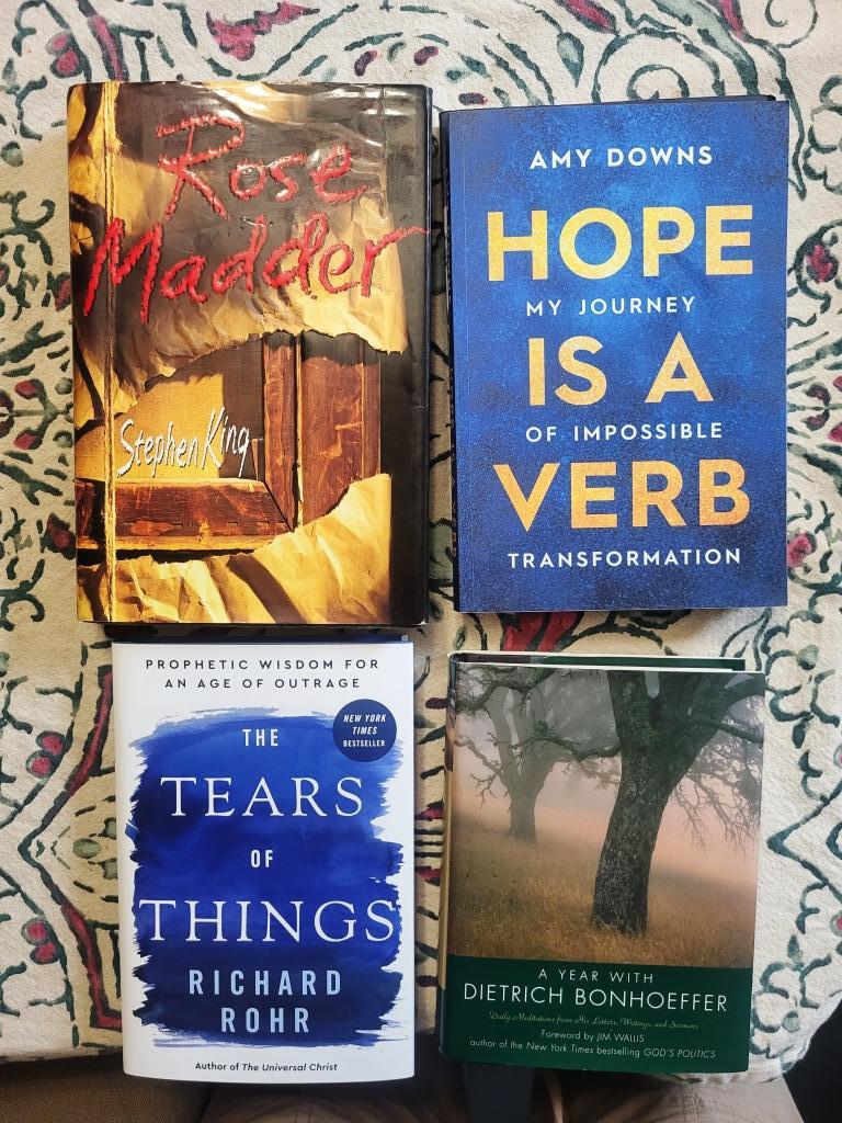 FIVE, Currently Reading: A novel by Stephen King to enjoy spooky season. It’s so good. Different from most of his stories, more emotional and thought provoking so far. I already mentioned the Amy Downs memoir, but it’s still on my side table while I work on a proper book review. A brand new book by Richard Rohr, which I am exploring with two of my favorite thinky friends. And a devotional based on writings by Dietrich Bonhoffer. I won’t actually start this until January, and I will start it alongside another daily devotional based on writings by C.S. Lewis. But I just received it from a secondhand Ebay seller. And isn’t the cover beautiful for October?