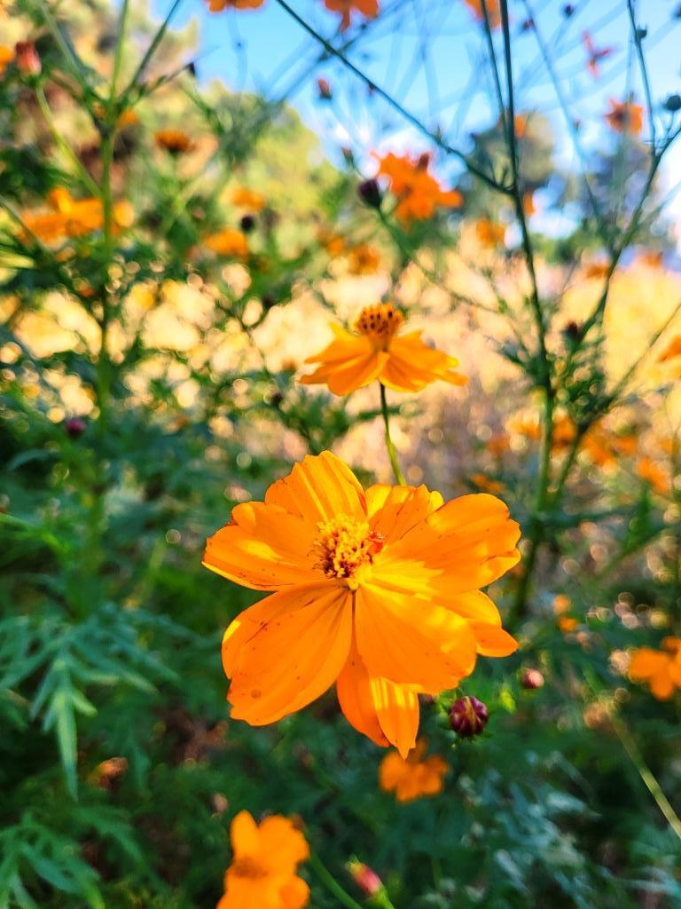THREE, Glowy cosmos: I’m just gazing at and soaking up hundreds of details in the landscape as autumn takes hold of the farm. Most plants are dried and dormant already, but the trees are wearing their finery and these cosmos are still glowing. Until about Thursday of this week, the cosmos were still loaded with dozens of enormous Monarch butterflies. I think most of them have moved on now.