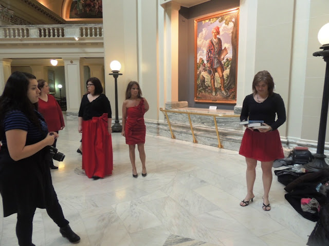 Saturday morning, then, we all got dolled up and dressed in our personalized bits of red and met at the Oklahoma State Capitol. The group’s wardrobe choices ranged from shimmery knee-length cocktail numbers to a gorgeous floral kimono, a sharp red blazer, a pin-up style wrap dress, an adorable flouncy mini skirt, and my goofy altered vintage slip. We all took the advice aiming at personal expression and ran with it! I have to admit, I felt nervous at first, showing up in something I thought only I would like, but that nervousness quickly melted and was replaced by lots and lots of fun.