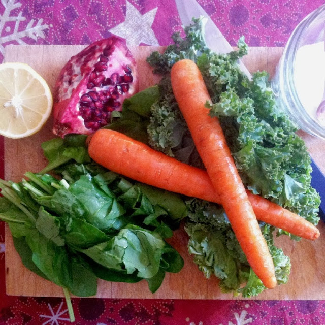 In a season when nearly every day of the week, for many consecutive weeks, we have good reasons to celebrate… and celebrating often means rich, sweet, salty, and otherwise decadent (but not so good for you) food… In a time of year when carbs and sugar are the fashionable thing to both crave and serve… I often end up fed up and in need of a potent dose of fresh, raw, vitamin-heavy nourishment to set my body straight. And I’m no nutritionist, but these particular ingredients are kind of famous for their health benefits: Kale, spinach, carrots, pomegranate, and lemon. It’s all kind of a no-brainer, and these items are abundant in wintertime. The fact that they taste downright amazing together is reason enough to eat Winter Wellness Salad several times a week.